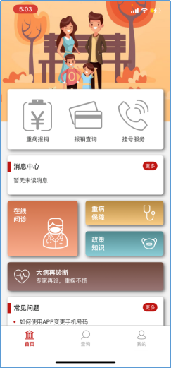 参保人员可通过中E家园APP点击“在线问诊”,由全职医生为参保人员本人提供医疗咨询、病情分析、病情指导等专业问诊服务。